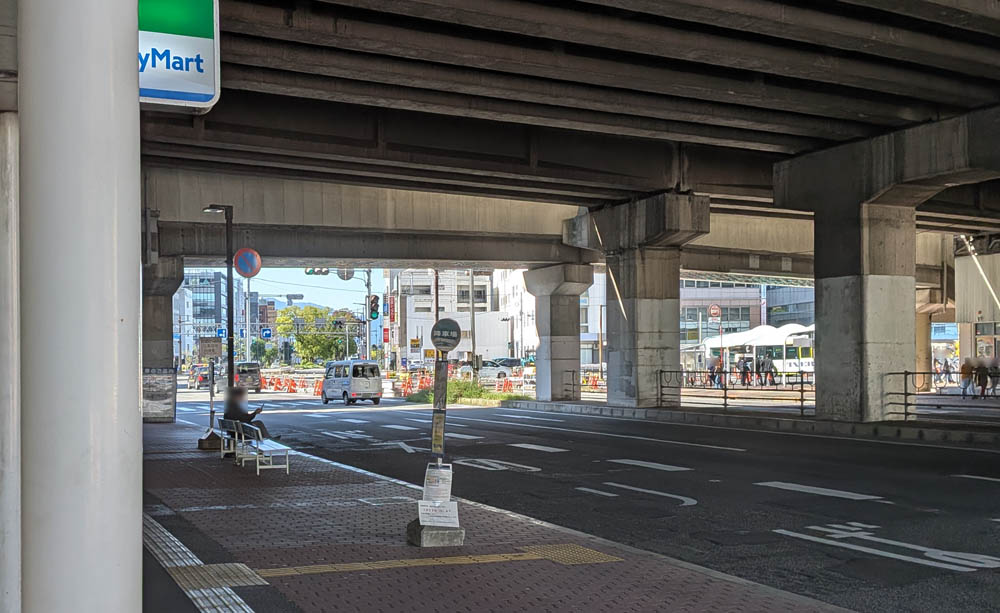 階段を下りて右側に進むと、高架下に南バスのりばがあります。あすなろう鉄道とファミリーマートが目印です。