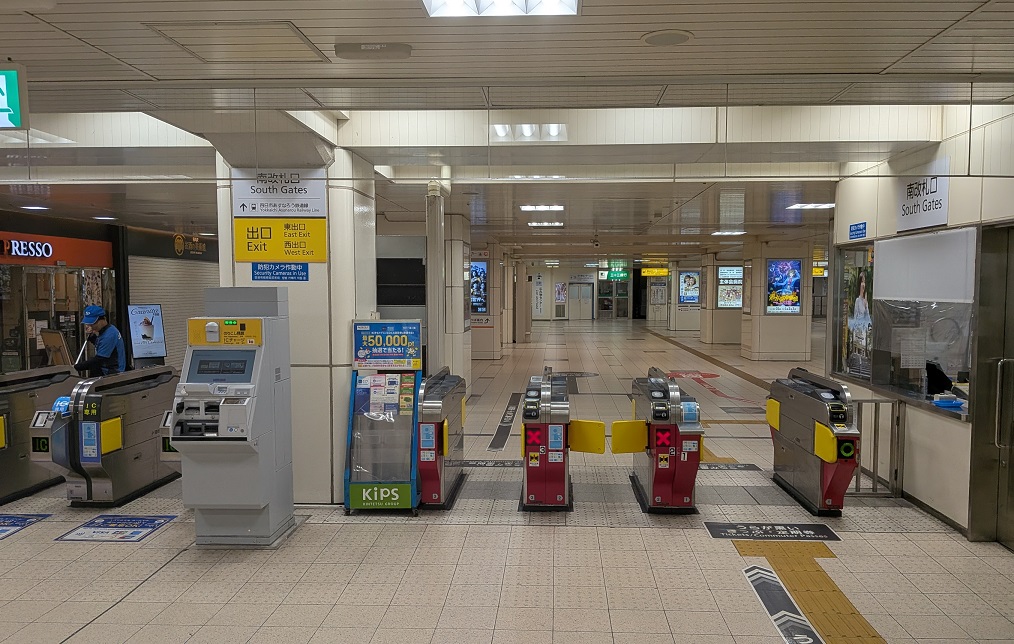 駅のホームから改札口を出る時、南と北の2箇所があります。西バスのりばと南バスのりばに乗車する際は、必ず黄色い看板が目印のシュークリーム店側に近い改札口から出てください。