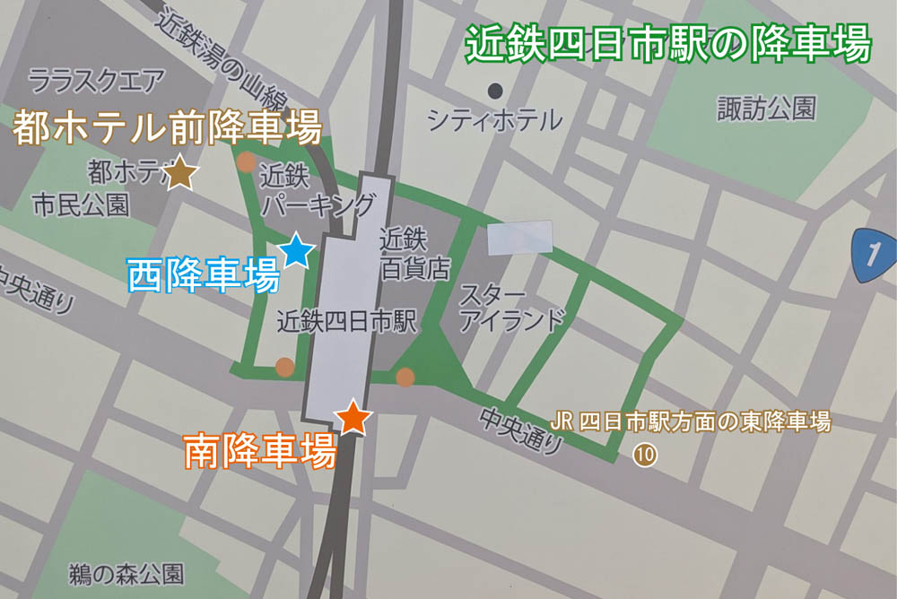 近鉄四日市駅のバス降り場は主に3箇所あり、西降車場、南降車場、都ホテル前降車場があります。