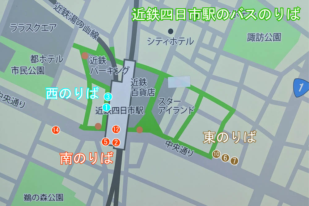 近鉄四日市駅ではバスの乗り入れ台数が多いため、西乗り場・南乗り場・東乗り場の3箇所があります。